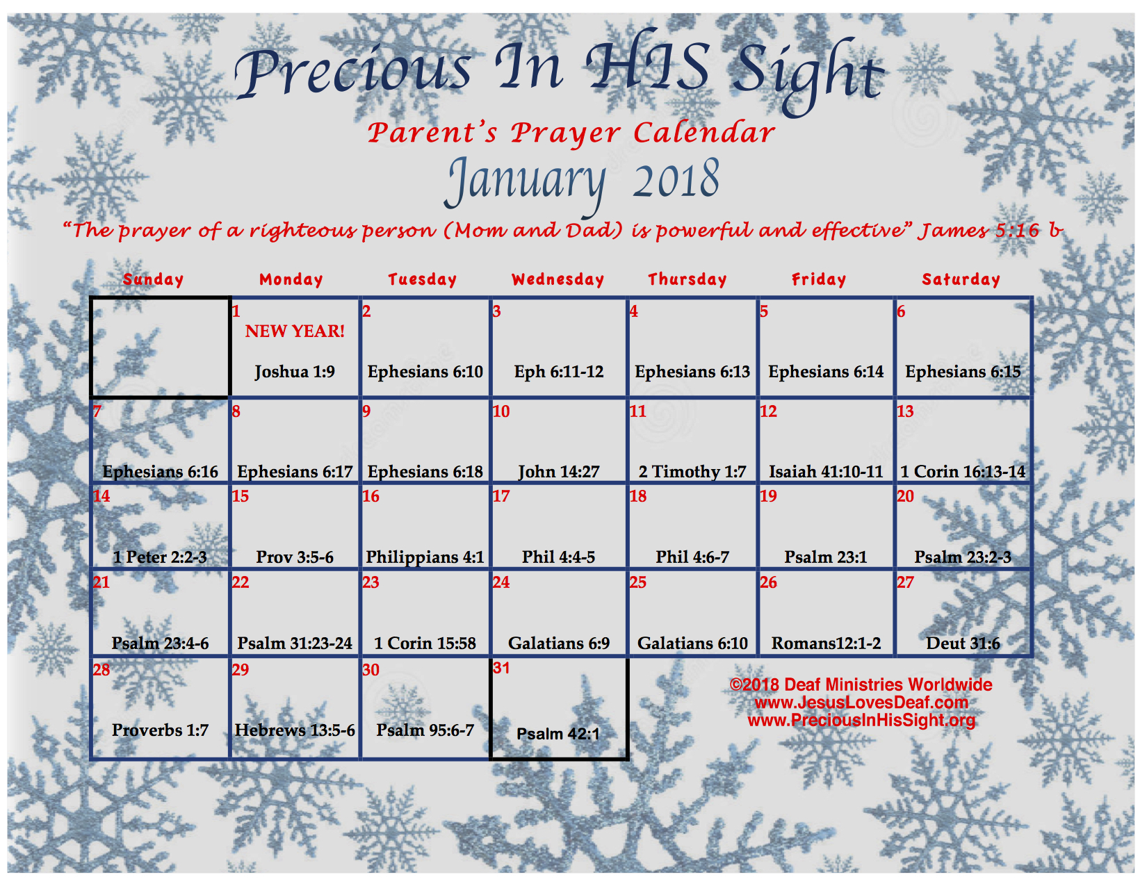 PreciousInHisSightJan2018To the left is this month’s Calendar. Click on the Calendar it opens BIGGER in a separate window so that you can read the scripture references easily. Look up the verse-for-the-day and turn it into a prayer. I print my Calendar and keep it with my Bible. Feel free to print the Calendar, too.