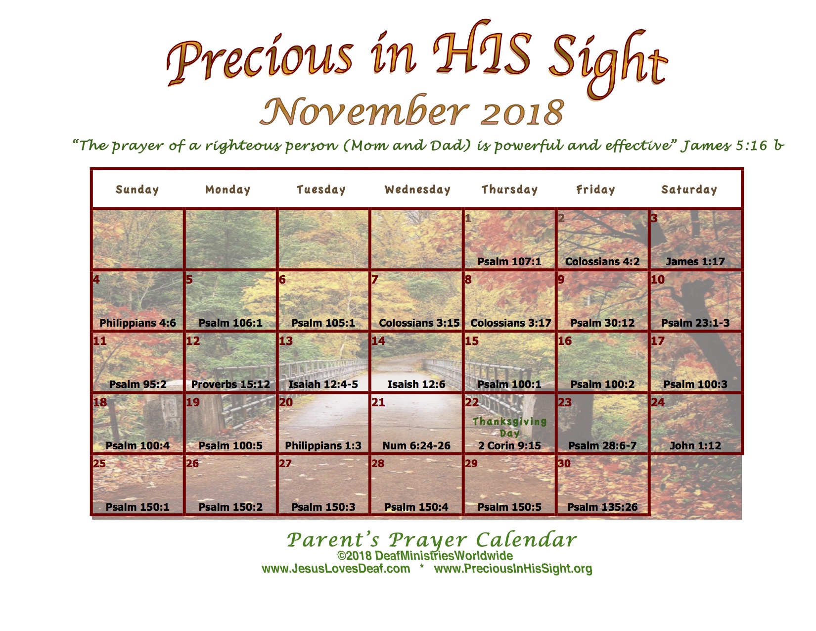 This month we celebrate Thanksgiving. Every verse on the Precious in HIS Sight Prayer Calendar is about being thankful.